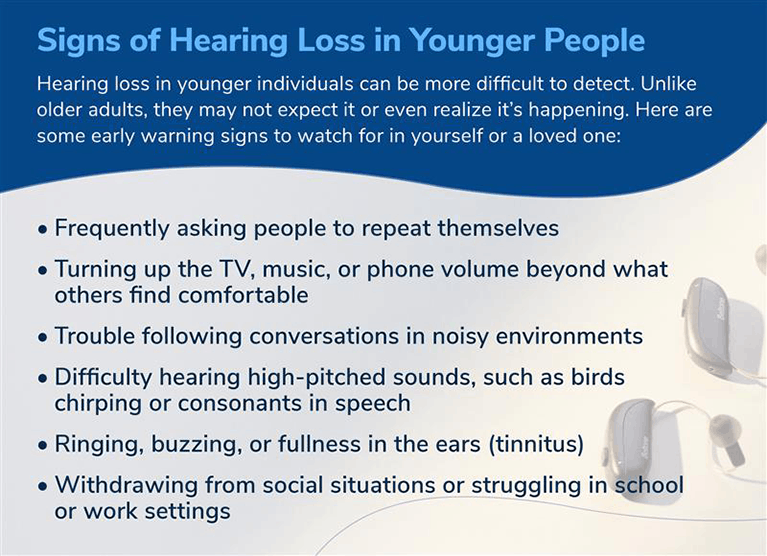 Hearing loss in younger individuals can be more difficult to detect. Unlike older adults, they may not expect it or even realize it’s happening. Here are some early warning signs to watch for in yourself or a loved one: